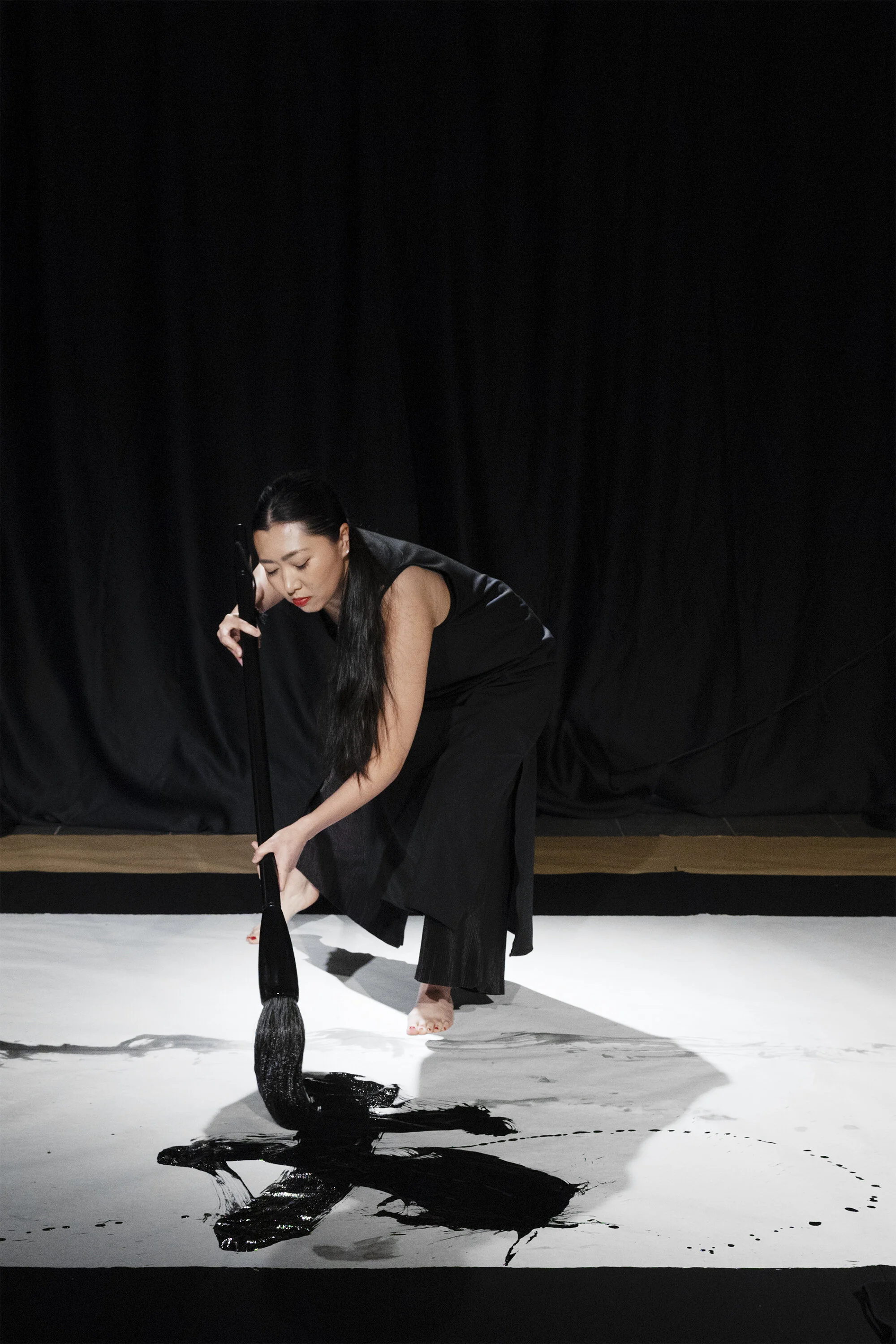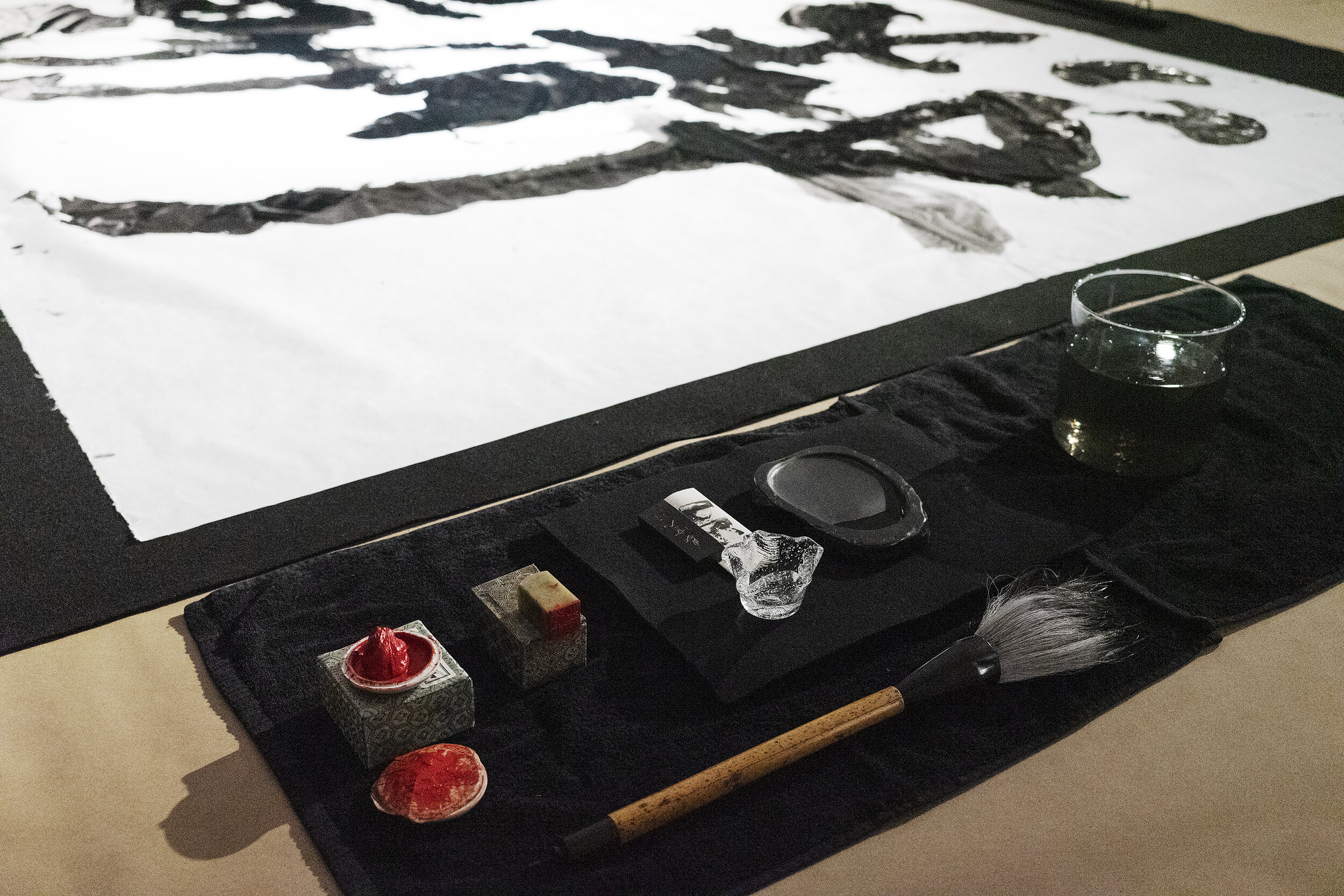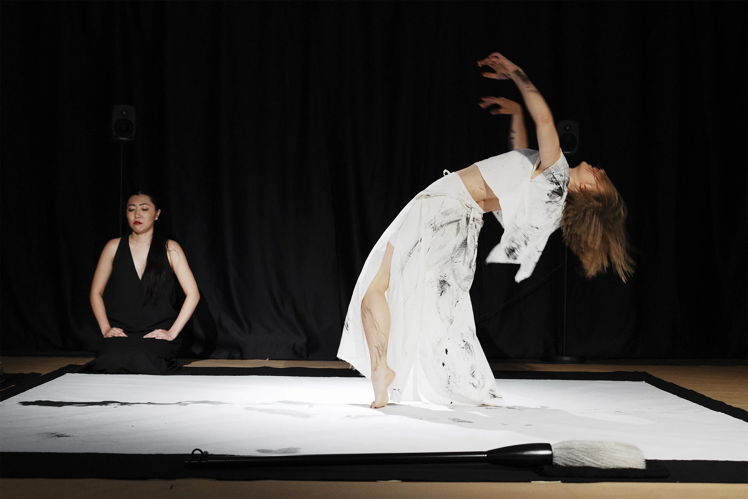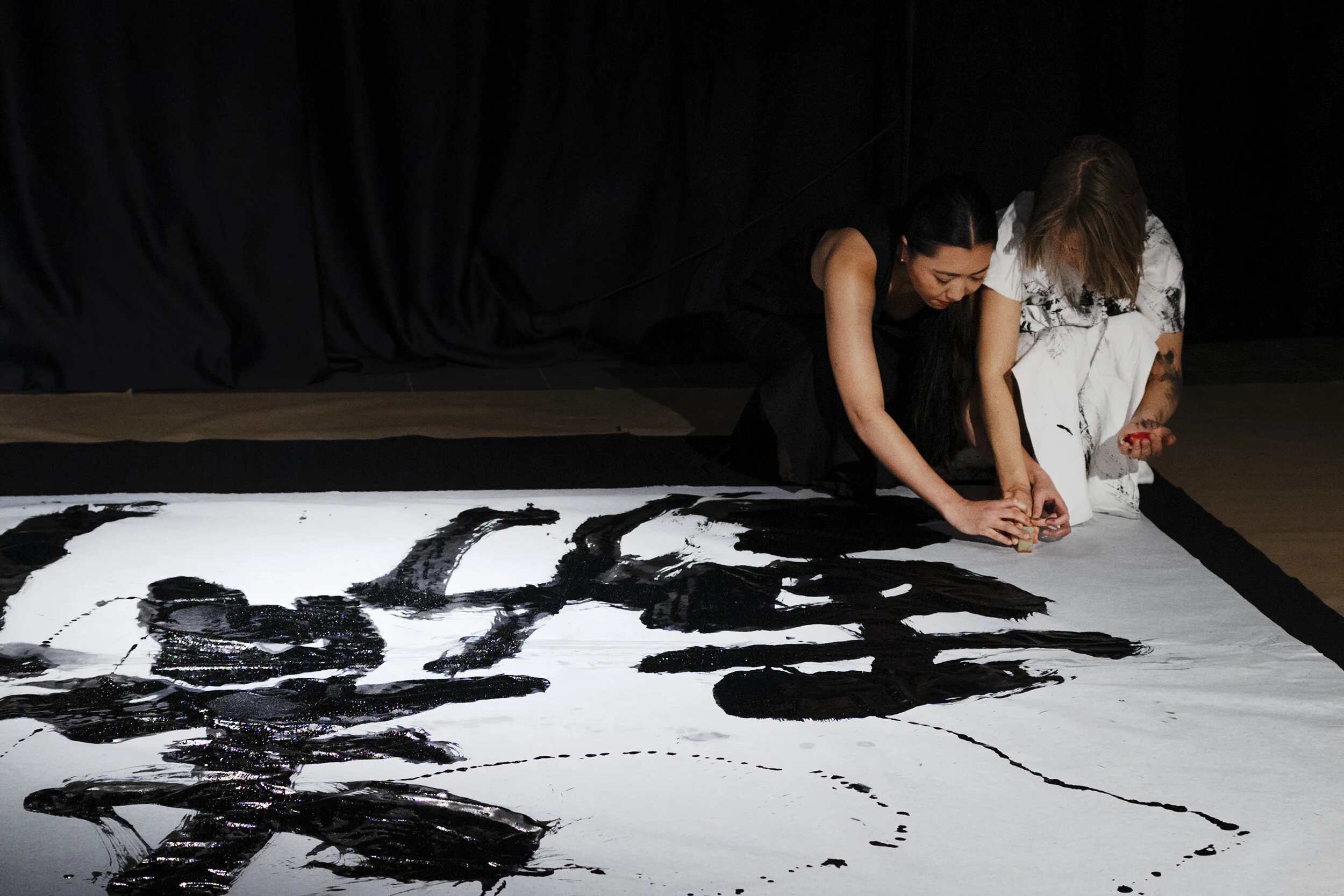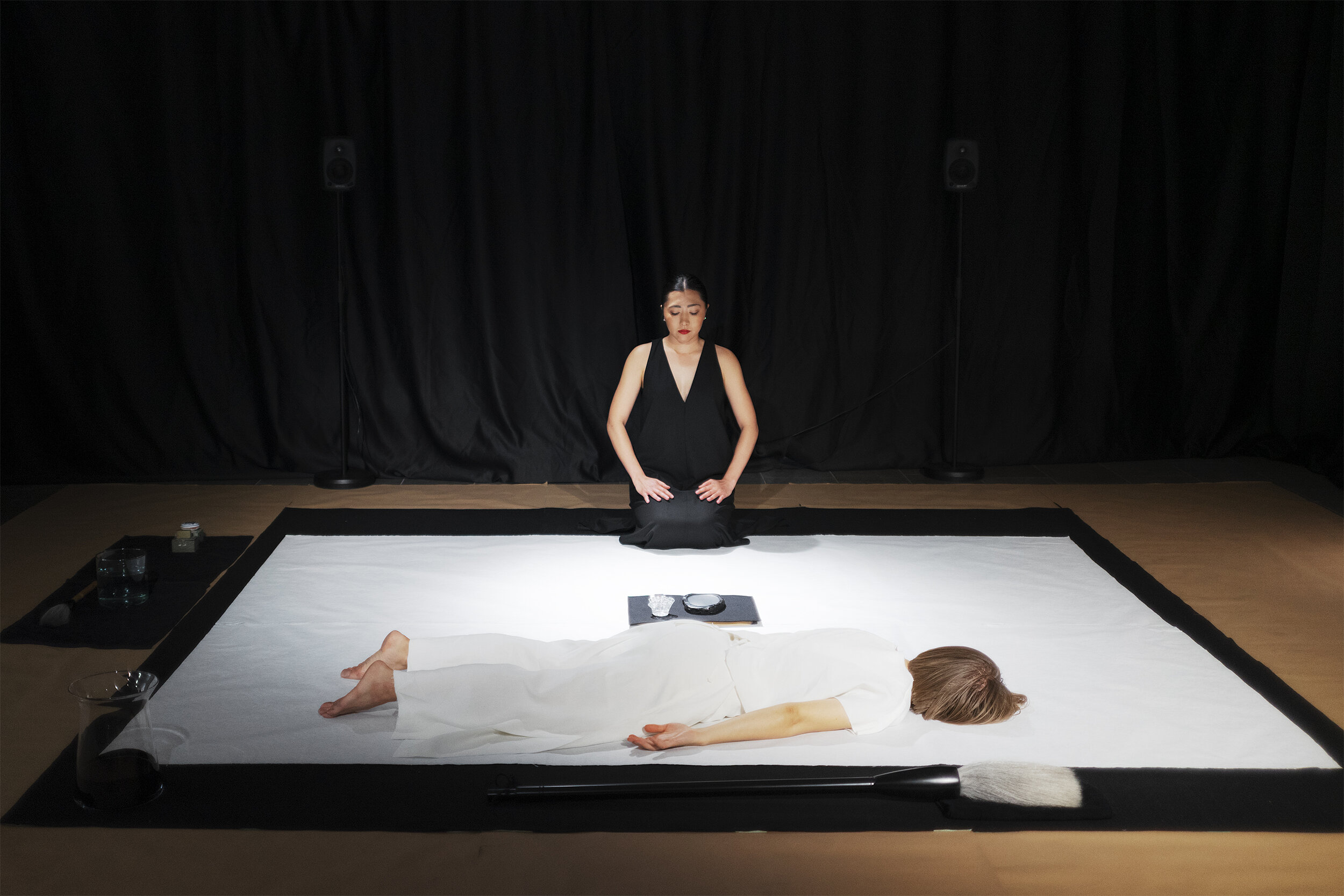 Starting point for the performance have been the japanese characters ‘jodo’ 静動 which describe silence and movement. We have interpreted ‘jodo’ through calligraphy, movement and sound - exploring together what kind of stillness and movement arise from writing the characters. Because Malla and Mäkiö are new to Japanese calligraphy, the interpretations are a combination of Yamamoto’s indepth skill and lingering with the unknown.